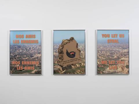 The Alphabet revisits Marcel Broodthaers’ Poèmes industriels, replacing the Latin alphabet with an Arabic one. The original exclamation of ‘OK!’ survives unscathed, despite the transmogrification from the secularized world of Latin to the sacred script of Arabic.