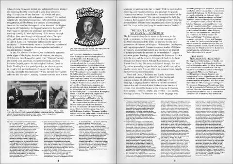 Kirchgängerbanger is a reader on Johann Georg Hamann, the 18th century polemicist, frenemy of Kant, and proto-Postmodernist who critiqued the Enlightenment with an unlikely mix of Lutheran theology and vulgar sexuality, enough to make even Bataille blush: “My coarse imagination has never been able to conceive of the creative spirit without genitalia.” With an introduction by Slavs and Tatars and a selection of essays by J.G. Hamann including the triple-platinum hits ‘New apology of the Letter H’ and ‘New Apology of the Letter H by Itself.’