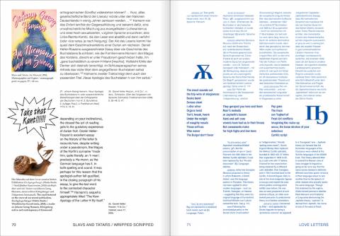 The emphatic, Arabic versions of the latin letters S/Z, ظ/ ض grace the cover of Süddeutsche Zeitung further highlighting Slavs and Tatars' investigation of language as a nexus of sensualized politics. These letters are considered highly specific to the Arabic language with one epithet for Arabic being “the language of the dhad” in reference to the letter ظ).
