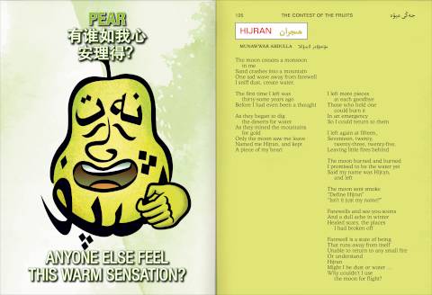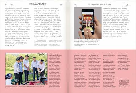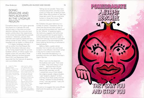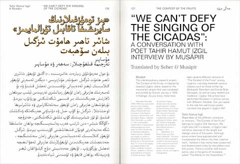 Co-published by MIT Press and Haverford College on the occasion of The Contest of the Fruits animation, the publication features essays by leading scholars and journalists that cover topics ranging from Uyghur script changes to rap in China, from silence to satire. Other contributions take a more tentacular approach: with a selection of poetry by diaspora Uyghur poets and insight on Chinese Muslim calligraphy, maintaining cultural heritage, the Sufi practice of Samā', mäshräp, and pop music.