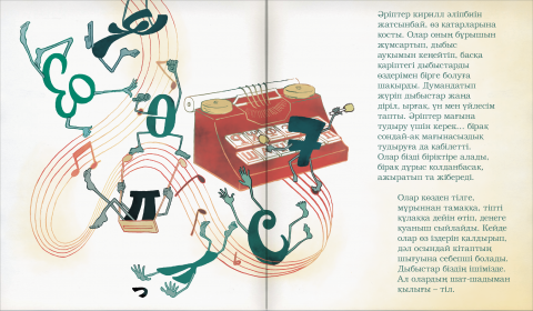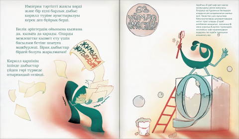 Azbuka Strikes Back (English & Kazakh), 2024, offset print, 19.6 × 22.8 cm, 16 pages, colour throughout, glue binding, spot UV varnished cover, push button sound module. Published by Walther and Franz Koenig / Tselliny, Almaty. ISBN 9783753304304